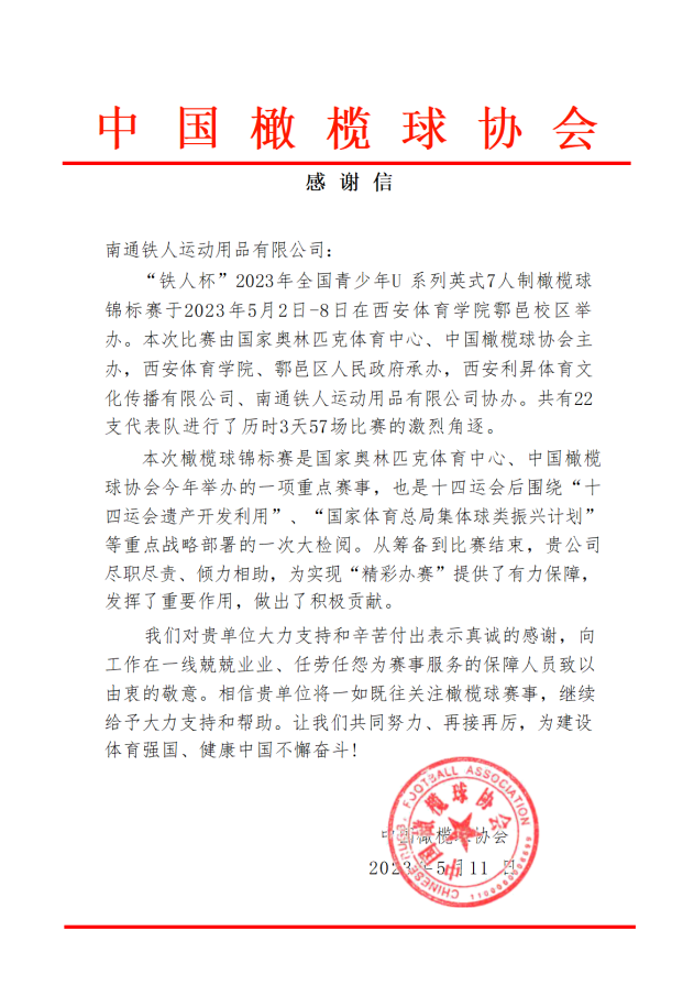 近日,中國橄欖球協會向鐵人體育發來感謝信,忠心感謝鐵人體育作為合作單位予以中國橄欖球協會備戰和保障的大力支持。