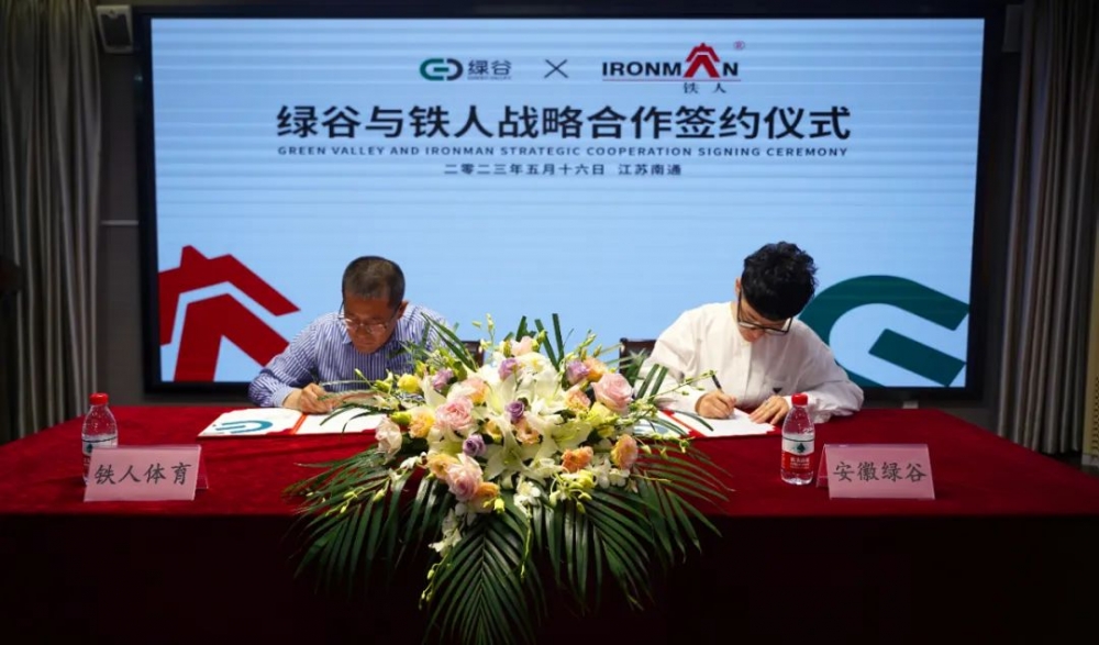 5月16日上午鐵人體育與安徽綠谷戰(zhàn)略合作簽約儀式在南通鐵人運(yùn)動(dòng)用品有限公司舉行,鐵人體育集團(tuán)總裁郭留平與綠谷總裁俞海燕簽署了戰(zhàn)略合作協(xié)議。鐵人集團(tuán)運(yùn)營(yíng)總裁秦銀波、國(guó)內(nèi)事業(yè)部副總經(jīng)理田亞龍以及安徽綠谷團(tuán)隊(duì)成員共同見(jiàn)證了此刻。