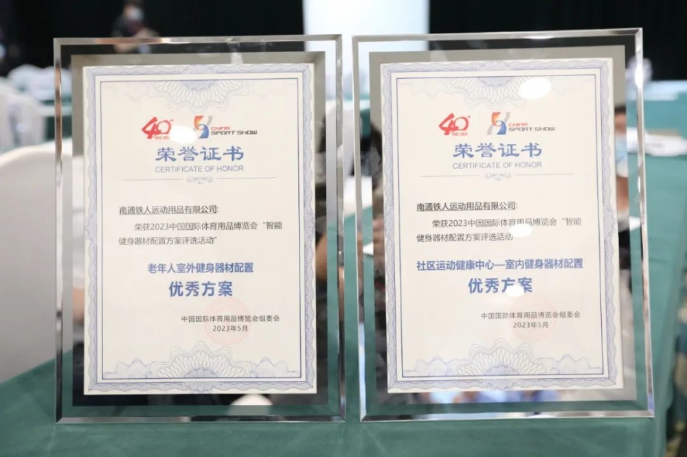 在中國國際體育用品博覽會組委會主辦的“2023中國體博會智能健身器材配置方案評選活動”中,鐵人體育的“老年人室外健身器材配置方案”、“社區運動健康中心-室內健身器材配置方案”以一體化的方案呈現,科學的區域規劃,適合老年人、青少年、中青年的健身器材,智能化健身平臺,得到體育系統用戶代表、政府采購專家、標準化專家所組成的評審組高度認可,獲得優秀方案獎。此外新研制的一款劃船訓練器獲得2023體博會“創新推優獎”,產品研發設計制造獲得2022年制造之美獎。
